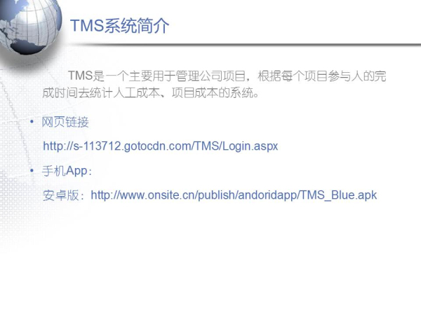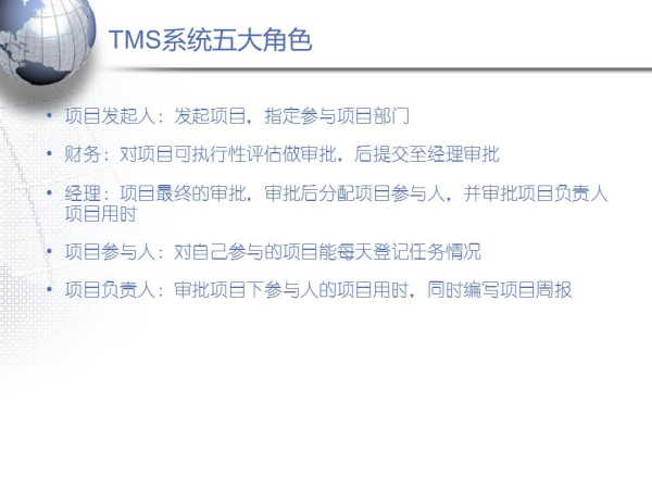 TMS是一个主要用于管理公司项目,根据每个项目参与人的完成时间去统计人工成本、项目成本的系统。