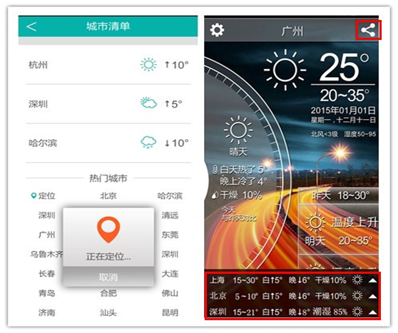 让你省时、省力,让你能及时获知家人、小伙伴们城市的天气变化状况。也可一键点击分享,变天立马为你送上祝福,送上叮嘱 。