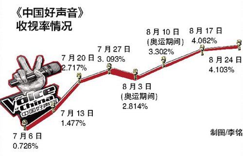 据相关媒体统计结果显示,《中国好声音》自开播以来,除奥运期间“好声音”收视有过一次小幅下滑外,其余每期都是在上升中。而随着上周五新一轮淘汰,《中国好声音》收视率再创新高,以4.103%的骄人成绩再次领跑全国综艺类节目。