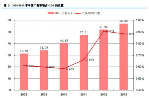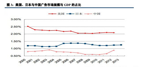 2013年中国广告市场规模占GDP的比重为0.90%,之前很长一段时间内徘徊在0.6%与0.75%之间,这一数值与美国、日本等国相比明显偏低,空间广阔。一方面,我国广告市场起步较晚,产业分散、市场成熟度较低,媒体资源价值没有得到充分挖掘。
