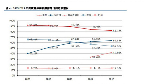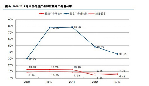 收入方面,2009~2013年传统媒体广告复合增长率为10.01%,而同期互联网广告复合增长率达52.84%。
