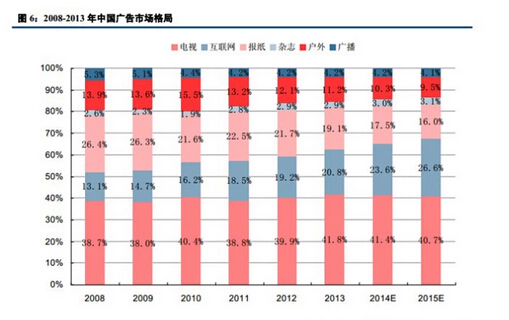 另一方面,国内企业总体处于产品广告阶段,对于品牌塑造、建设和维护尚未展开,广告预算相对较低。随着我国经济结构调整,创新战略、品牌战略的持续推进,我们认为国内广告主的预算将大幅提高,媒体资源价格还将继续上扬,共同推动广告市场规模的占比加速上升,逐步接近美国。未来五年,我们认为广告市场占GDP的比重可能达到1%-2%,复合增长率达到10%-20%,五年拥有万亿规模。