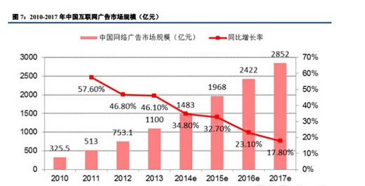 虽然中国互联网广告市场起步较晚,但是其发展十分迅速,2013年中国互联网广告市场规模突破了1000亿,实现1100亿的市场规模,与2010年325.5亿的市场规模相比,短短3年就增长超过2倍。根据艾瑞咨询的估计,预计2017年中国互联网广告市场规模将达到2852亿元,复合增长率为26.89%。