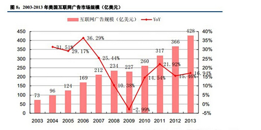 美国2013年的网络广告营收428亿美元,首度超过广播电视,十年复合增长率19.35%。单从规模上看,2013年国内互联网广告规模相当于美国2007年的水平,07-13年的复合增长率为12.42%,考虑到互联网广告在中国起步晚、占比较小,且传统媒体尚未充分挖掘的情况下就提前切换至互联网,我们认为未来5年互联网广告还将保持25%-35%的增长速度。